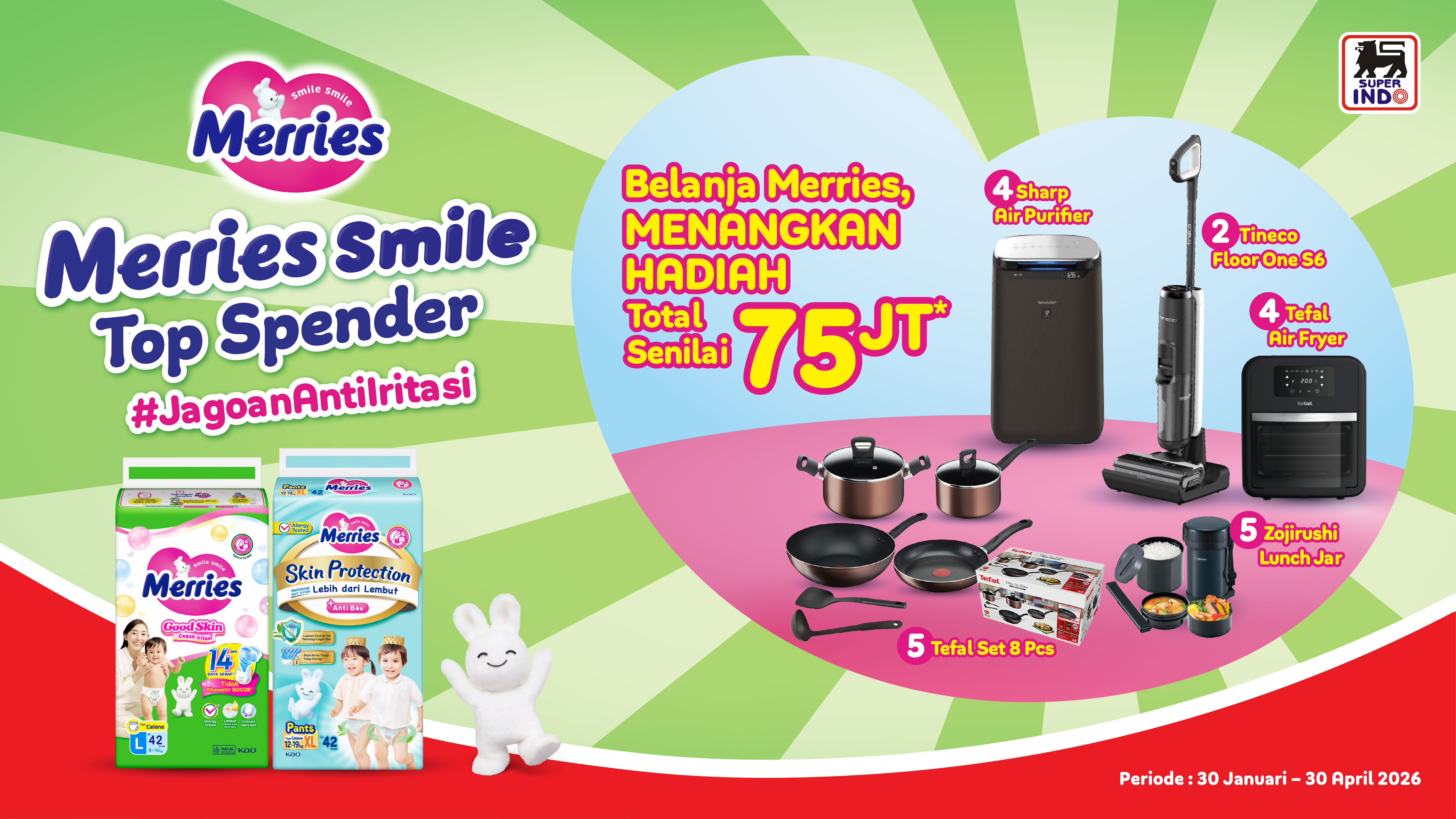 - Peserta wajib melakukan transaksi belanja produk Merries apa pun minimal 1 (satu) kali selama Periode Event dan setiap transaksi akan tercatat sesuai dengan nominal pembelian di Super Indo.